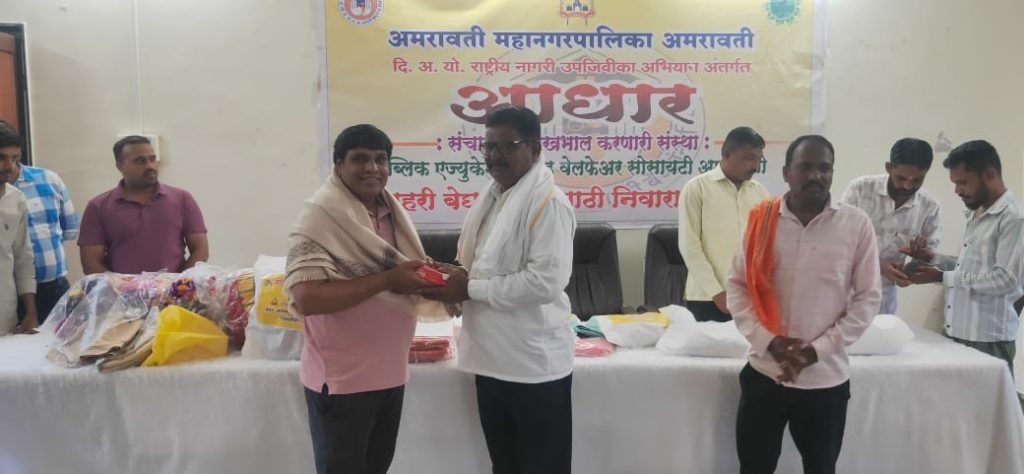मूर्तिजापूर : दिवाळी म्हणजे आनंद आणि वाटपाचा सण याच भावनेतून जनसेवक बाबुभाऊ देशमुख यांच्या मार्गदर्शनाखाली जगदंब प्रतिष्ठान (अंबागेट, बुधवारा, अमरावती) यांच्या वतीने बडनेरा येथील आधार निराधार केंद्रात निराधार महिलांना साडी–चोळी, पुरुषांना ब्लॅंकेट तसेच सर्वांना दिवाळी फराळाचे वाटप करण्यात आले.कार्यक्रमाला विदर्भ अध्यक्ष व कुस्तीगीर प्रशिक्षक पै. समीर देशमुख, गोविंद प्रभू संस्थानचे पंकजभाऊ, दिनेशभाऊ धस्कट, समाजसेवक सचिनभाऊ वाटकर, तसेच आधार केंद्राच्या संचालिका ज्योतीताई राठोड आणि राजीव सर बसवनाथे प्रमुख उपस्थित होते.या उपक्रमाचे सुयोग्य नियोजन जगदंब प्रतिष्ठानचे संस्थापक अध्यक्ष गौरव बेलूरकर, उपाध्यक्ष समीर देशमुख, अभिषेक जिरापुरे, निशांत जाचक, प्रसाद कानेलकर, मुकेश बिजवे, ऋषिकेश रिठे, शुभम भाऊ, हर्षल काळे, गोलू गाखरे, पंकज शेळके, भूषण ठाकूर, सुरेशभाऊ ठाकूर, राहुल भुरे, राहुल पंड्या, अखिल ठाकरे, वंश खोपे, तुषार गादे, रणजित सरदार,मयूर वीरूळकर, श्रीकांत गणेशकर, रोहित देऊळकर, प्रियंका ताई चौधरी, शालिनी नेवारे व शीतल सरदार यांनी उत्साहाने केले.कार्यक्रमाच्या शेवटी सर्व मान्यवरांचा सत्कार करून संस्थेच्या कार्याची प्रशंसा करण्यात आली. दिवाळीच्या या सामाजिक उपक्रमाने समाजात “खरी दिवाळी म्हणजे आनंदाचे वाटप” हा संदेश दिला.