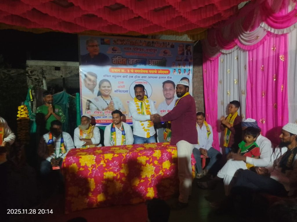 दर्यापूर, (प्रतिनिधी): अमोल चव्हाण वंचित बहुजन आघाडीच्या वतीने येथील प्रभाग क्रमांक ३ मध्ये २८ नोव्हेंबर रोजी निवडणूक बूथचे उत्साहात उद्घाटन करण्यात आले. यावेळी पक्षाचे पदाधिकारी आणि कार्यकर्त्यांनी मोठी गर्दी केली होती.या कार्यक्रमाच्या अध्यक्षस्थानी वंचित बहुजन आघाडीचे जिल्हाध्यक्ष संजय भाऊ चौरपगार हे होते. तर प्रमुख उपस्थितीमध्ये साबीर भाई कुरेशी, खैराती भाई कुरेशी आणि कदीर बेग यांचा समावेश होता.यावेळी प्रभाग क्रमांक ३ मधील वंचित बहुजन आघाडीचे अधिकृत उमेदवार जुबेर बेग (सर्वसाधारण पुरुष) आणि रविना ताई सुनील गवई (अनुसूचित जाती महिला) यांना उपस्थित मान्यवरांकडून शुभेच्छा देण्यात आल्या. कार्यक्रमाचे प्रास्ताविक राहुल गजभिये सर यांनी केले.अध्यक्षीय भाषणात संजय भाऊ चौरपगार यांनी दोन्ही उमेदवारांना भावी वाटचालीस शुभेच्छा दिल्या. ते म्हणाले, “तळागाळातील सामान्य माणसाला सत्तेच्या प्रवाहात आणणे आणि त्यांना न्याय मिळवून देणे हाच वंचित बहुजन आघाडीचा मूळ संकल्प आहे. हा संकल्प सिद्ध करण्यासाठी कार्यकर्ते आणि नागरिकांनी एकजूट दाखवावी.”बूथच्या या उद्घाटनप्रसंगी प्रभागातील नागरिक आणि वंचित बहुजन आघाडीचे कार्यकर्ते मोठ्या संख्येने उपस्थित होते..